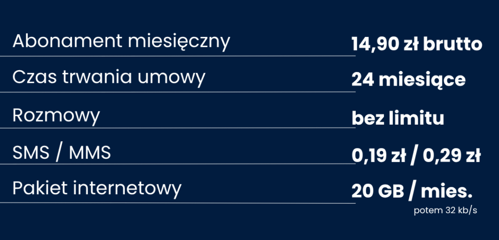 Pakiet transmisji danych do wykorzystania w Polsce wynosi 20 GB w tym 4,44 GB do wykorzystania w roamingu w ramach Unii Europejskiej, Islandii, Liechtensteinu i Norwegii. Niewykorzystany pakiet danych w danym okresie rozliczeniowym nie przechodzi na kolejny okres rozliczeniowy.