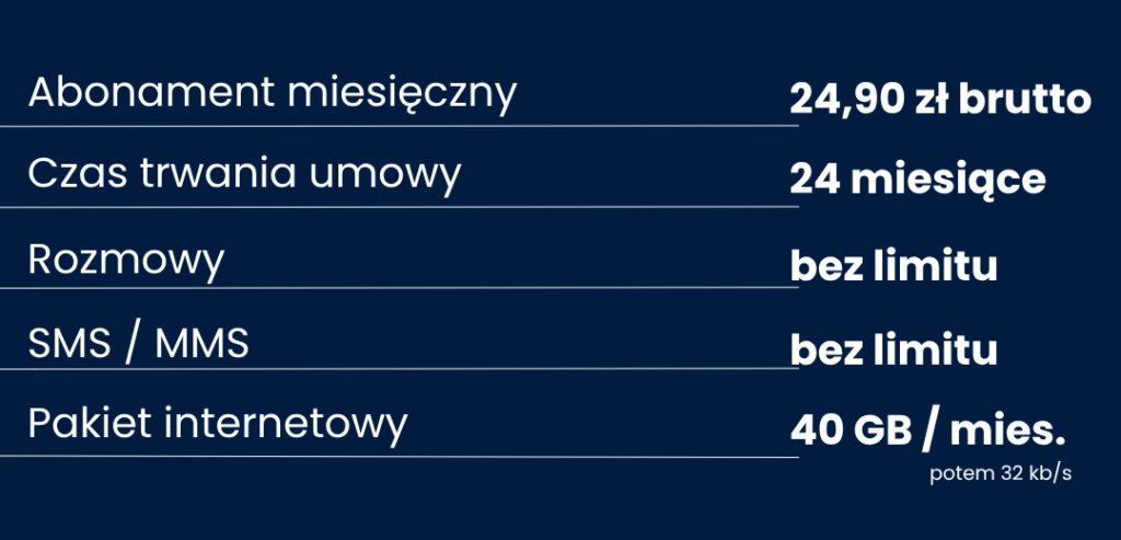 Pakiet transmisji danych do wykorzystania w Polsce wynosi 40 GB w tym 7,41 GB do wykorzystania w roamingu w ramach Unii Europejskiej, Islandii, Liechtensteinu i Norwegii. Niewykorzystany pakiet danych w danym okresie rozliczeniowym nie przechodzi na kolejny okres rozliczeniowy.