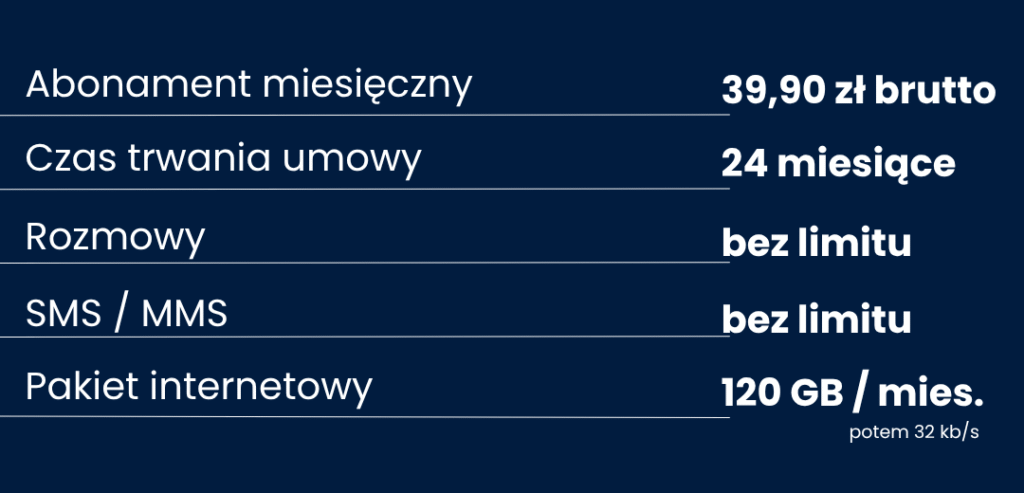 Pakiet transmisji danych do wykorzystania w Polsce wynosi 120 GB w tym 11,88 GB do wykorzystania w roamingu w ramach Unii Europejskiej, Islandii, Liechtensteinu i Norwegii. Niewykorzystany pakiet danych w danym okresie rozliczeniowym nie przechodzi na kolejny okres rozliczeniowy.